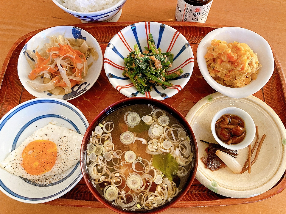 朝飯 牛蒡と人参のきんぴら、菠薐草の胡麻和え、しもつかり、目玉焼き、なめこのたまり炊、たまり漬「七種きざみあわせ・だんらん」、らっきょうのたまり漬「小つぶちゃん」、ごぼうのたまり漬、メシ、若布と長葱の味噌汁