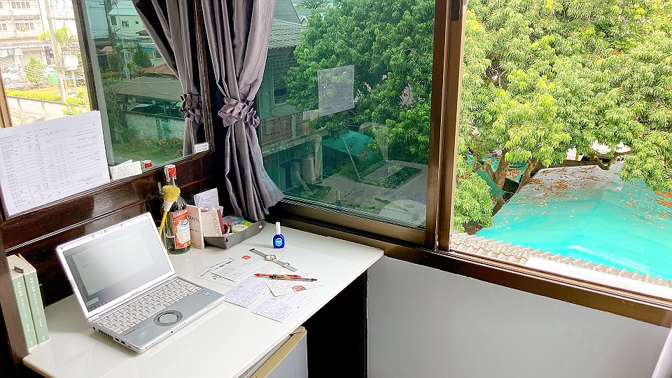 15:45 ホテルにチェックインを果たす。「五階まではエレベータ、その先は階段を上がって欲しい」とフロントのオネーサンに言われた部屋のドアを開けた途端「おー」と声が漏れる。想像以上に広く、想像以上に明るく、想像以上にモダンで、バスルームにはバスタブまで備わっていた。宿泊料の1,960バーツは、チェックインの際に現金で支払った。