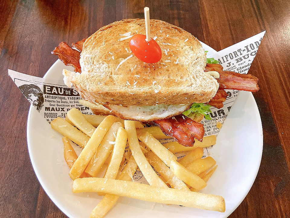 昼飯 “The Hungry Nest”のベーコンと目玉焼きのサンドイッチ、タイのミルクティー