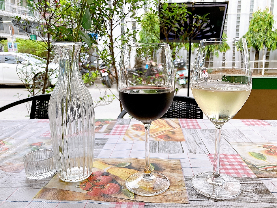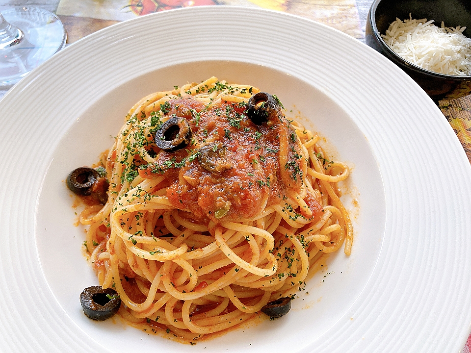 晩飯 “Pizza&Pasta by Hungry Nest”のスパゲティプッタネスカ、赤と白のグラスワイン