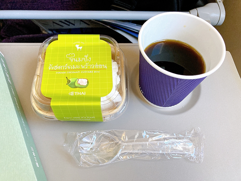 今日のTG131は、ほぼ満席。配られた軽食のスプーンを、手を滑らせてシートと壁のあいだに落とし、しかしどう手探りしても拾えないため、客室乗務員に代わりをもらう。