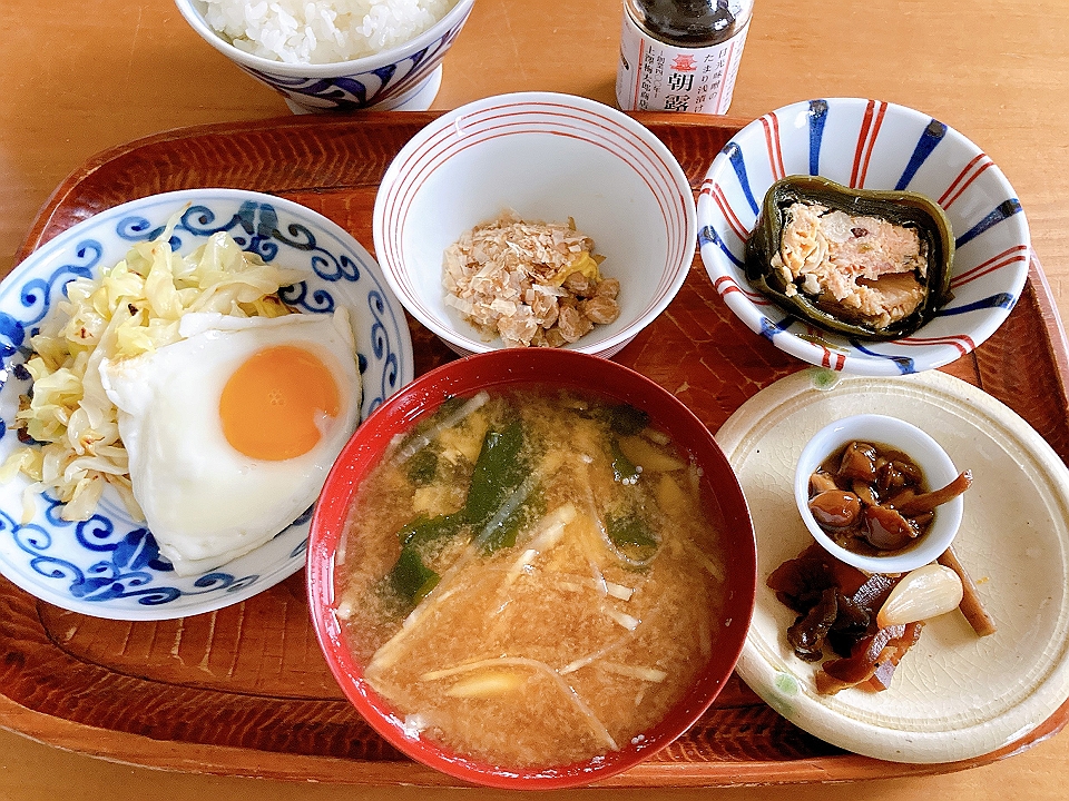 朝飯 キャベツのソテーを添えた目玉焼き、納豆、鮭の昆布巻、なめこのたまり炊、たまり漬「七種きざみあわせ・だんらん」、らっきょうのたまり漬「小つぶちゃん」、ごぼうのたまり漬、メシ、大根と若布の味噌汁
