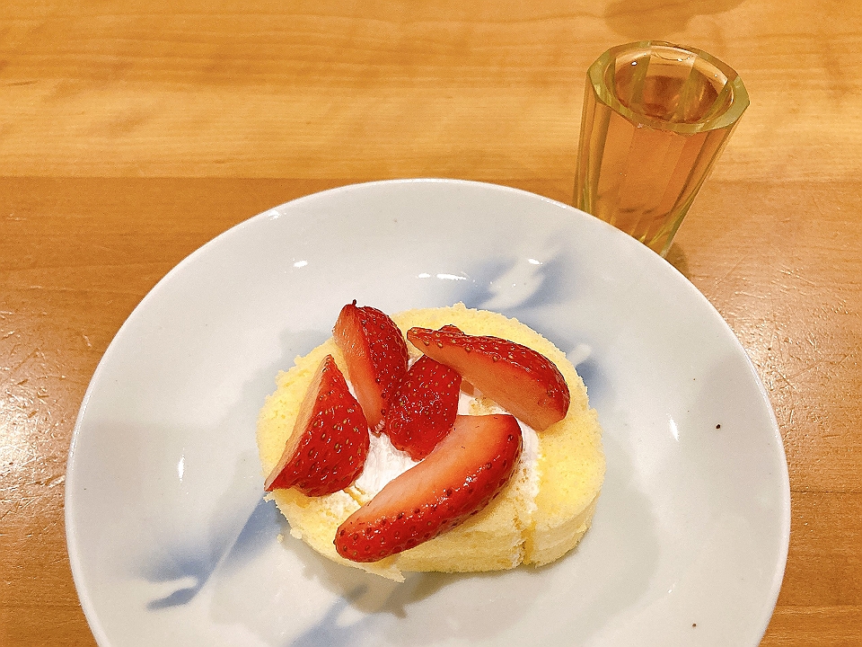 晩飯 菠薐草の胡麻和え、牛蒡と人参のきんぴら、おでん、胡瓜と蕪のぬか漬け、「日の丸醸造」の「まんさくの花神力70」(燗)、いちごのロールケーキ、Old Parr(生)