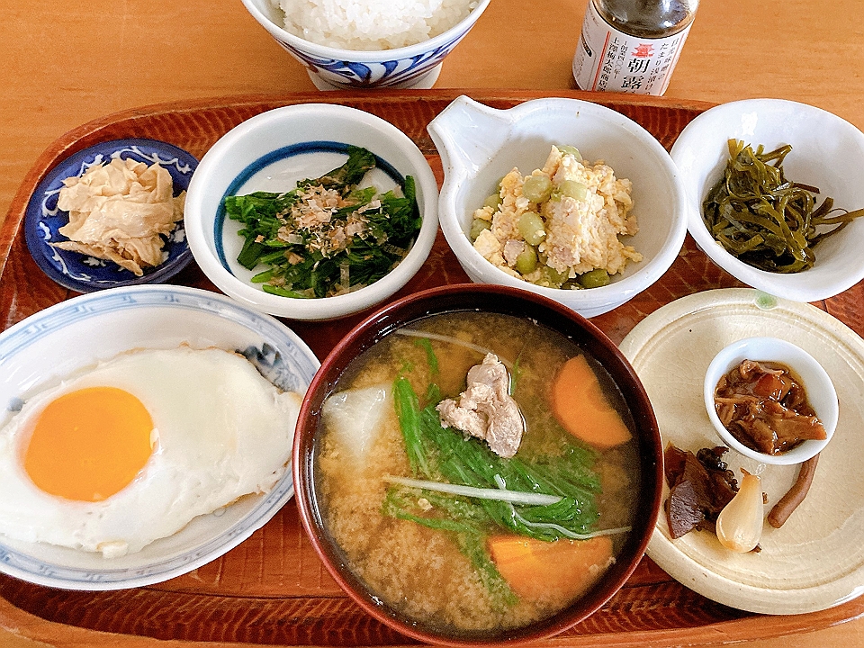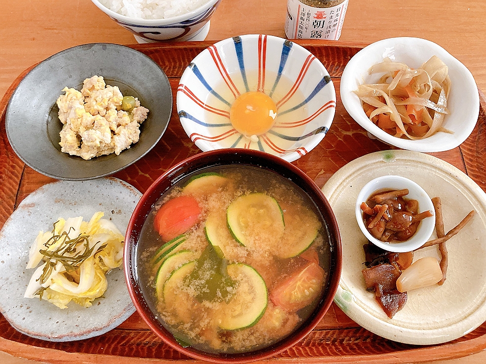 朝飯 目玉焼き、納豆、菠薐草のソテー、揚げ湯波の甘辛煮、なめこのたまり炊、たまり漬「七種きざみあわせ・だんらん」、らっきょうのたまり漬「小つぶちゃん」、ごぼうのたまり漬、メシ、トマトとズッキーニの味噌汁