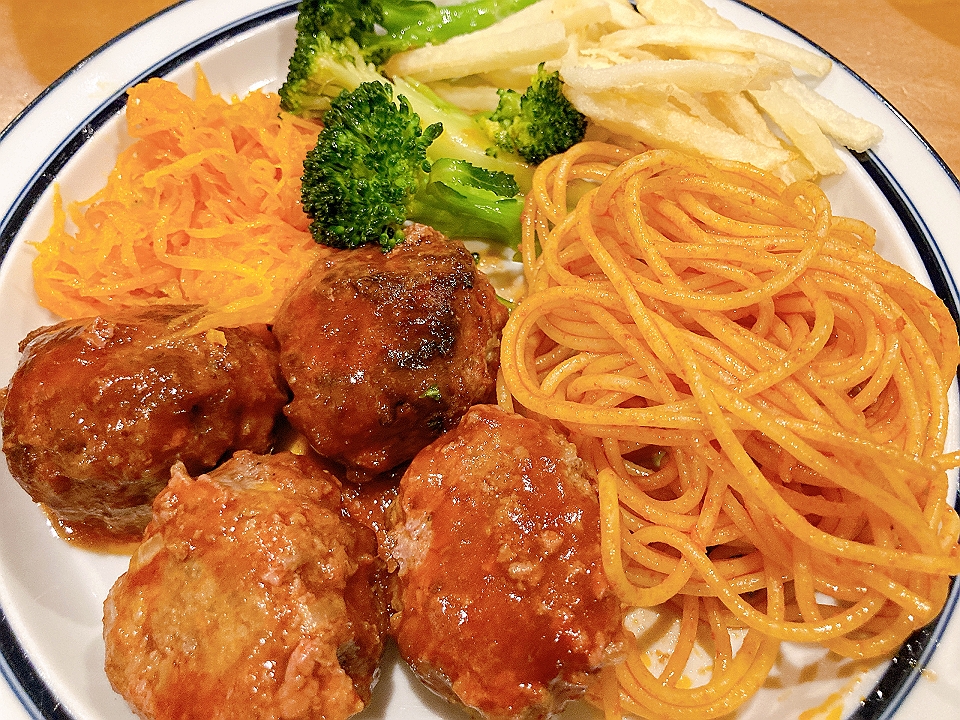 晩飯 キャロットラペとブロッコリーのソテーとポテトフリットとケチャップスパゲティを添えた煮込みハンバーグ、Chablis Billaud Simon 2018、いちごのショートケーキ、Old Parr(生)