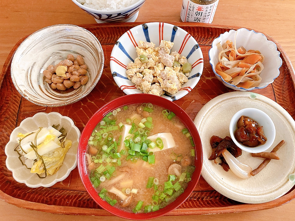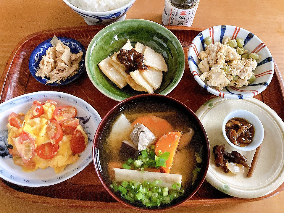 朝飯 トマトのスクランブルドエッグ、揚げ湯波の甘辛煮、唐風呂大根の素揚げ「日光味噌ひしお」和え、炒り豆腐、なめこのたまり炊、たまり漬「七種きざみあわせ・だんらん」、らっきょうのたまり漬「小つぶちゃん」、ごぼうのたまり漬、メシ、大根と人参と椎茸とゴボウと鶏肉と万能葱の味噌汁