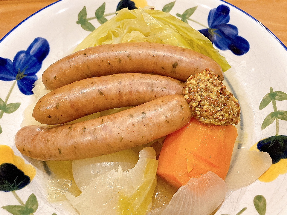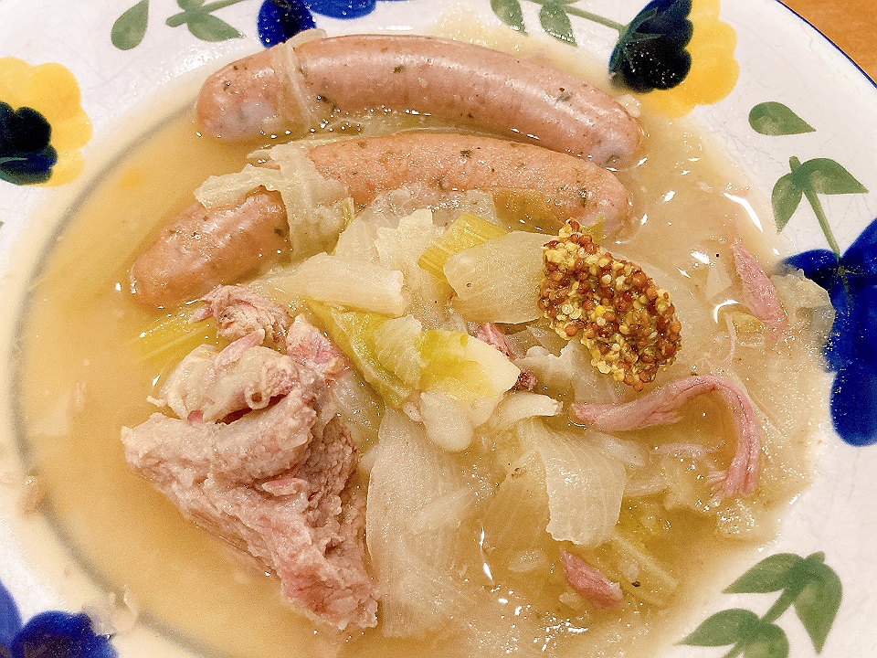 晩飯 ドライ生ハム、チーズ、らっきょうのたまり漬「小つぶちゃん」、TIO PEPE、トマトとレタスのサラダ、二種のパン、ポトフ、Chablis Billaud Simon 2018