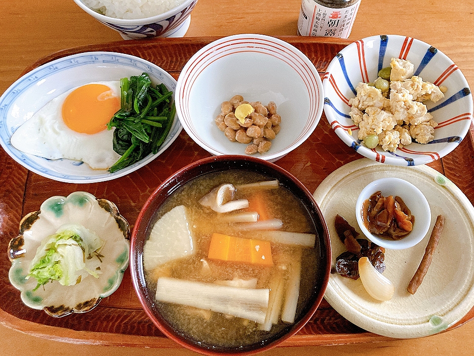 朝飯 菠薐草のソテーを添えた目玉焼き、納豆、炒り豆腐、白菜漬け、なめこのたまり炊、たまり漬「七種きざみあわせ・だんらん」、らっきょうのたまり漬「小つぶちゃん」、ごぼうのたまり漬、メシ、大根と人参と椎茸とゴボウと鶏肉の味噌汁