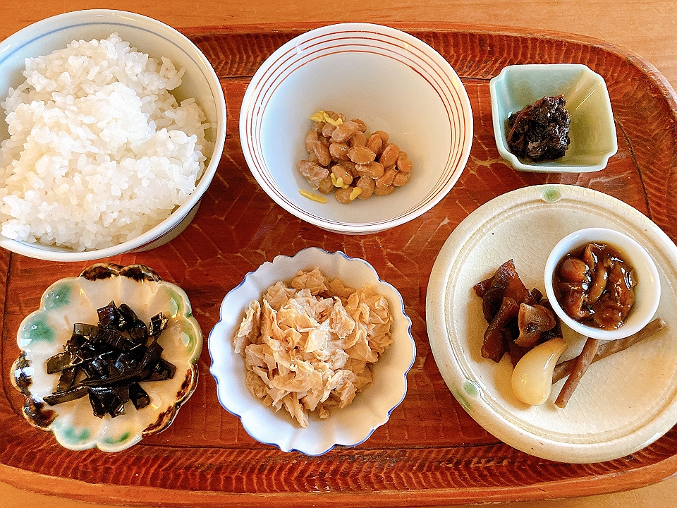 朝飯 納豆、しその葉の梅酢漬け、昆布の佃煮、揚げ湯波の甘辛煮、なめこのたまり炊、たまり漬「七種きざみあわせ・だんらん」、らっきょうのたまり漬「小つぶちゃん」、ごぼうのたまり漬のお茶漬け