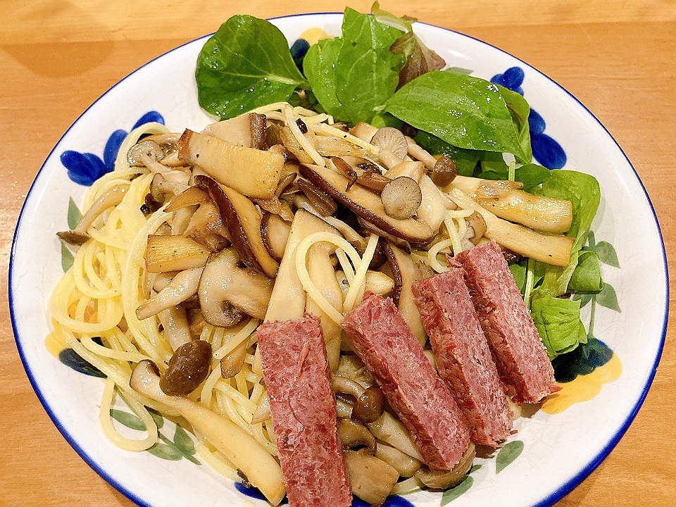 晩飯 チーズ、らっきょうのたまり漬「小つぶちゃん」、TIO PEPE、三種の茸とコンビーフのスパゲティ、Chablis Billaud Simon 2018