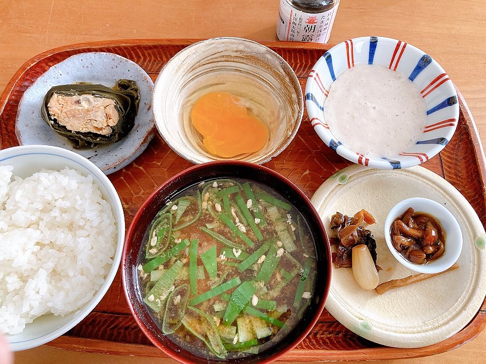 朝飯 鮭の昆布巻、生玉子、山芋のすり下ろし、なめこのたまり炊、たまり漬「七種きざみあわせ・だんらん」、らっきょうのたまり漬「小つぶちゃん」、ごぼうのたまり漬、メシ、若布と長葱の味噌汁