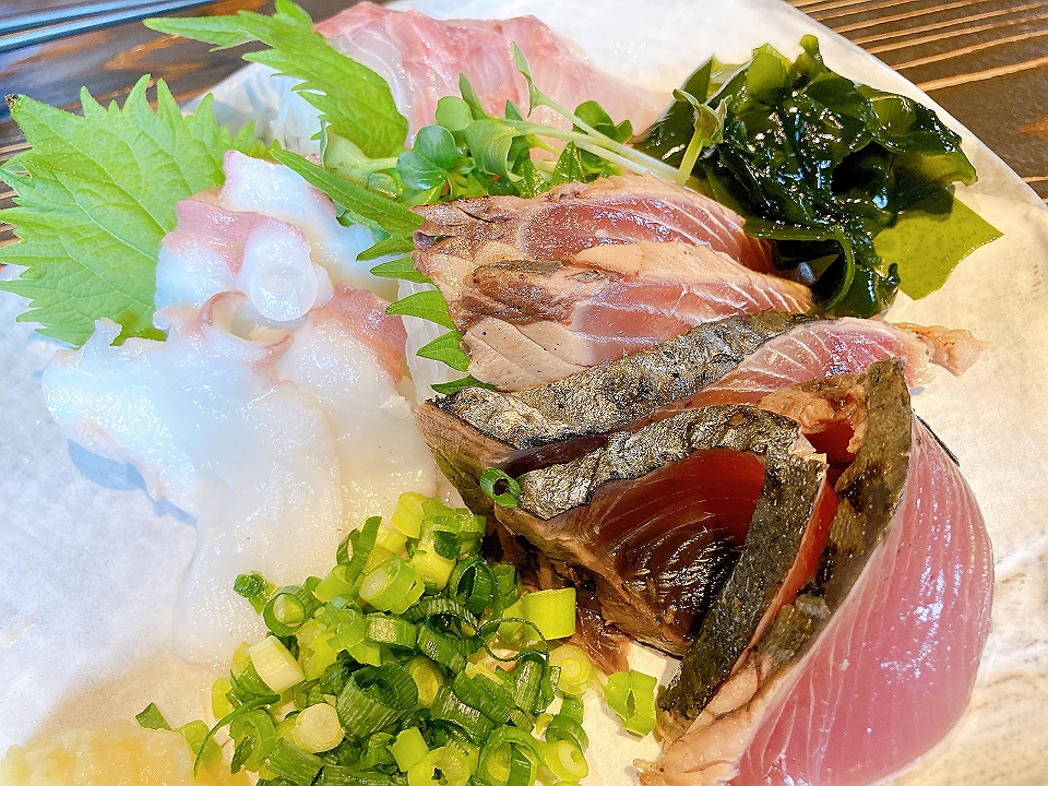 晩飯 「やまだ宴楽」のお通しの鶏手羽揚げ、刺身の盛り合わせ、揚げ出し豆腐、クリームコロッケ、他あれこれ、芋焼酎「三岳」(お湯割り)