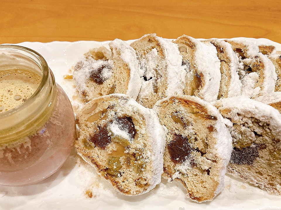 晩飯 チーズ、らっきょうのたまり漬「小つぶちゃん」、TIO PEPE、2種のパン、ガーリックパン、レバーペーストとシュトーレン、チキンライス、ポトフ、Chablis Billaud Simon 2018