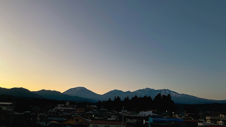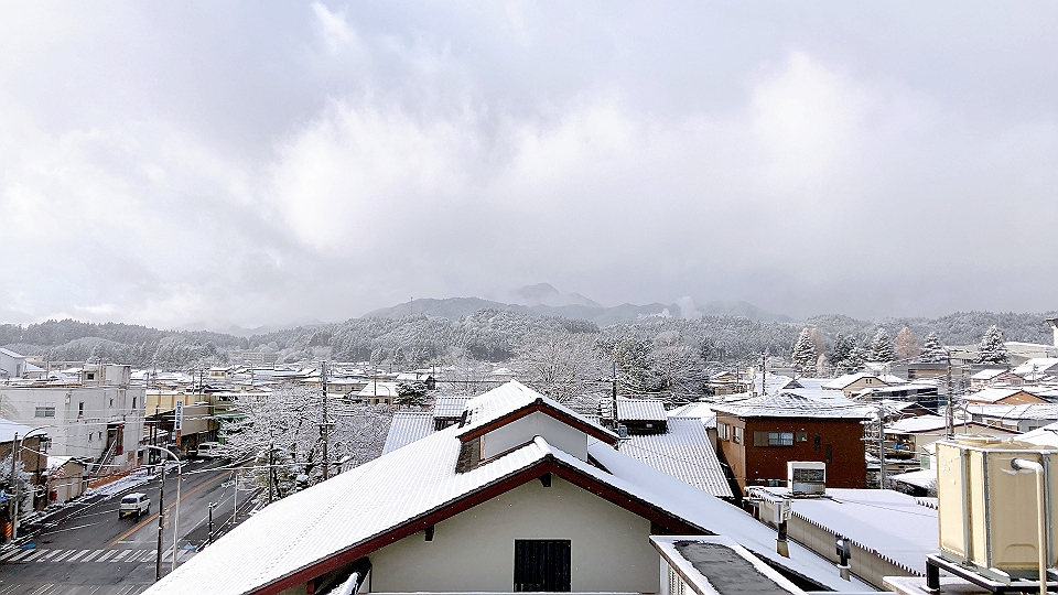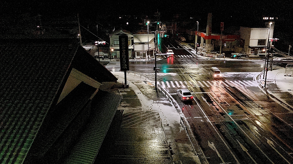 「夜半と未明のあいだ」と書いても、一体全体、それが何時ごろをいうかは知らない。とにかく午前3時ころに起きて寝台を降り、北西に面した窓のカーテンをずらすと、外には雪が舞っていた。屋根の上は真っ白、店の駐車場も歩道も真っ白。ただし国道119号線と121号線にはクルマの通行があるせいか、その白さは屋根のそれほどは厚くない。とにかく初雪である。