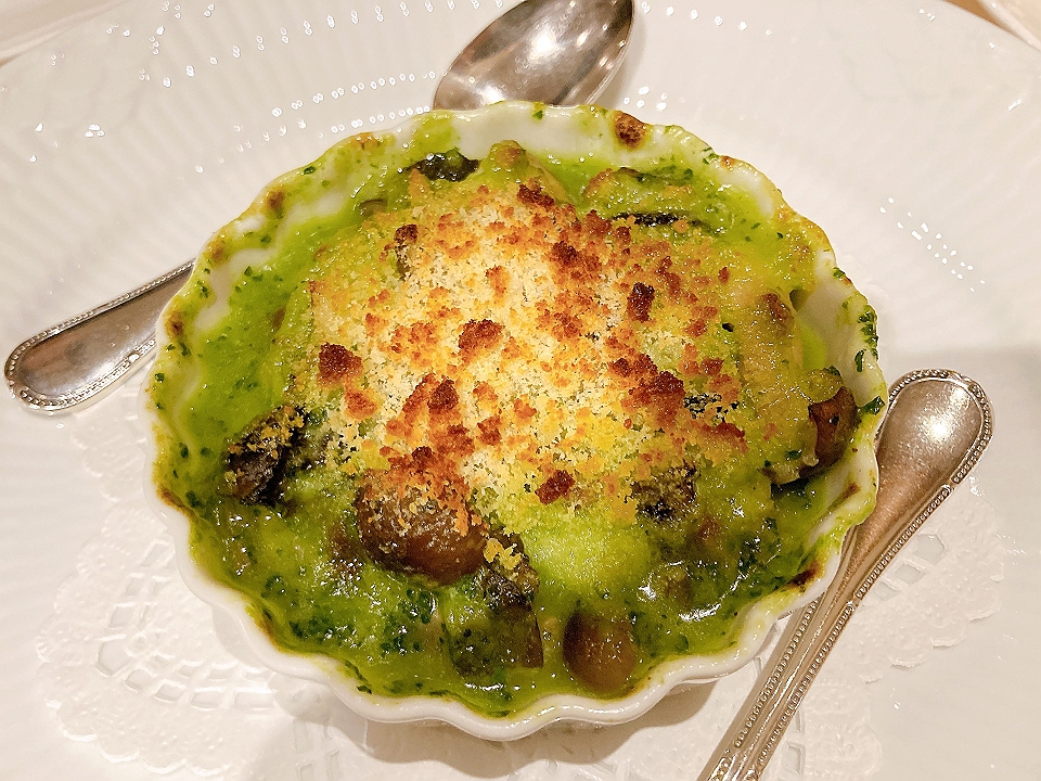 晩飯 “Finbec Naoto”のポテトサラダ、エスカルゴのブルゴーニュ風、生ハムのサラダ、三種のチーズ、南瓜のスープ、正月限定のカレーライス、きゅうりのたまり漬、らっきょうのたまり漬、ブルゴーニュの安い赤ワイン
