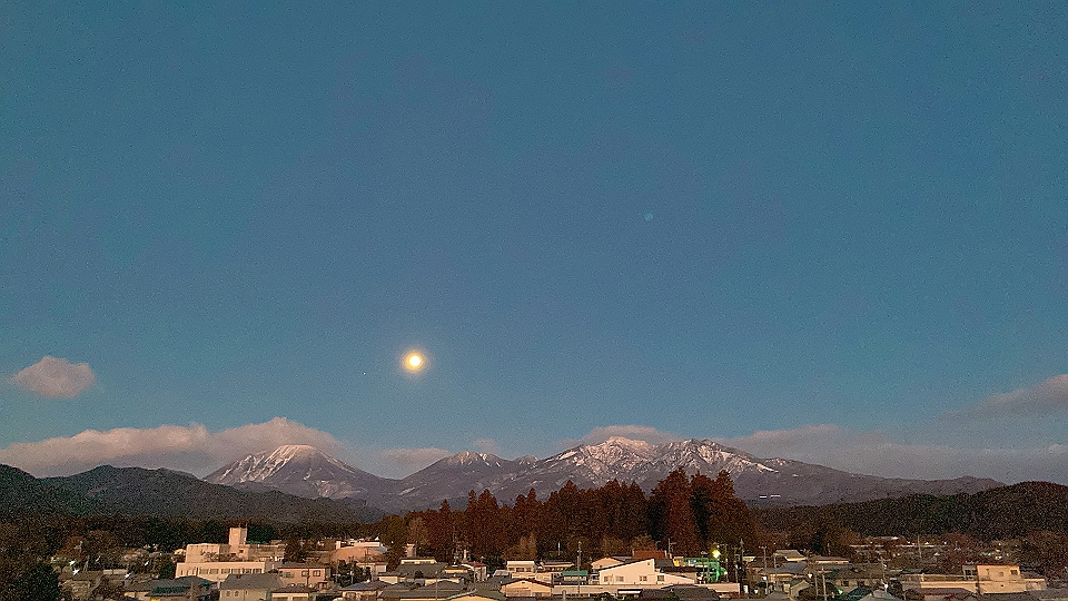 食堂でコンピュータをいじるうち、東の空が明け始める。その紅い色を捉えようとして屋上へ上がる。そして南東へ向けてiPhoneのホームボタンに何度か触れ「やれやれ」という気持ちできびすを返す。すると北西の空には雪の山を背にして、正円と思われる月が意外や大きくあった。思わず「おぉ」と声を漏らし、素足に履いた草履でそちらへ歩く。そしてその景色もまた、iPhoneに収める。