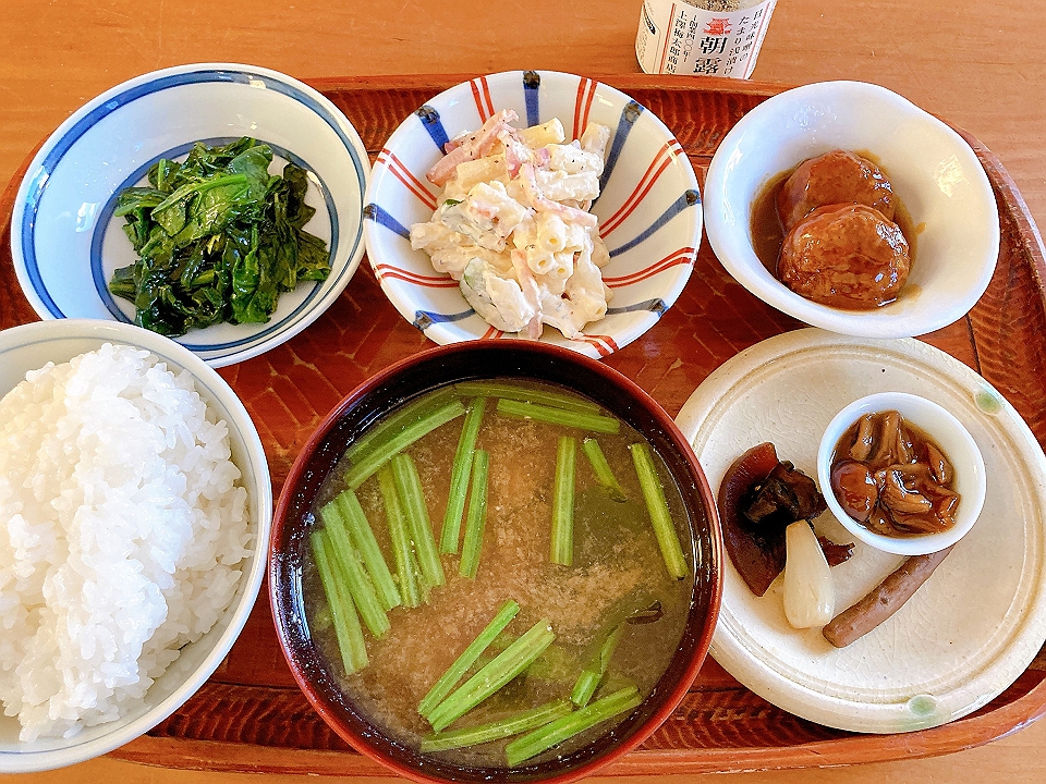 朝飯 菠薐草のソテー、マカロニサラダ、肉団子、なめこのたまり炊、たまり漬「七種きざみあわせ・だんらん」、らっきょうのたまり漬「小つぶちゃん」、ごぼうのたまり漬、メシ、菠薐草と若布の味噌汁