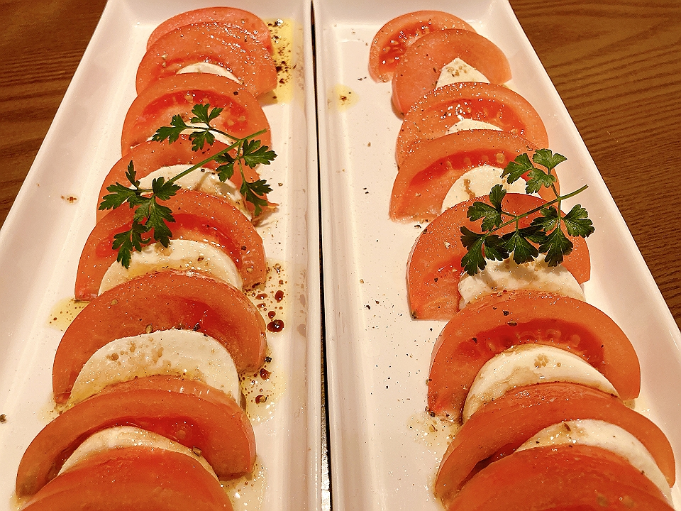 晩飯 「コスモス」のカプレーゼ、ドリア、サントリー「角」(お湯割り)