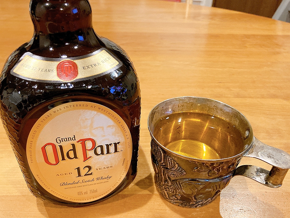 晩飯 らっきょうのたまり漬「小つぶちゃん」、たまり漬「七種きざみあわせ・だんらん」、三種のキノコのスパゲティ、Old Parr(お湯割り)、プリン、Old Parr(生)