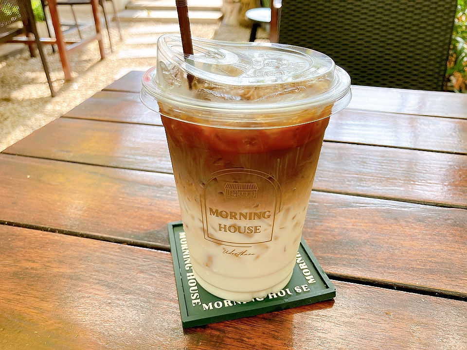 朝飯 “Morning House”の中華ソーセージと豚の挽き肉を挟んだベトナムパン、アイスカフェラテ