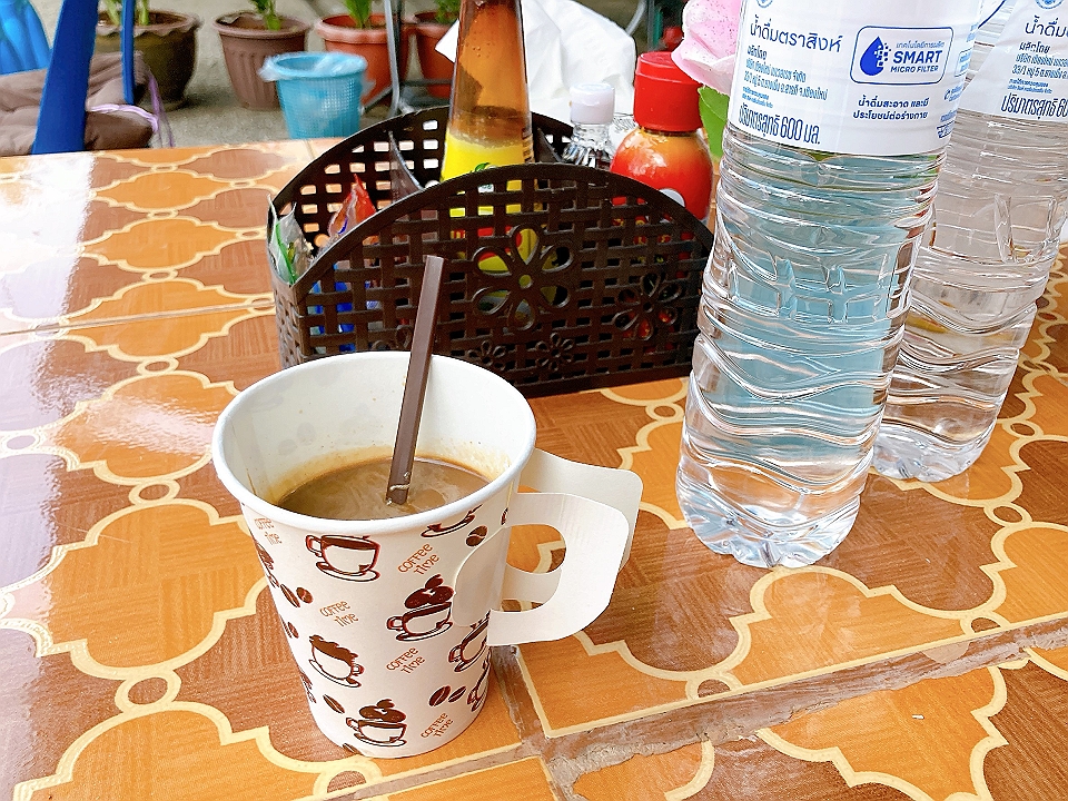 朝飯 ピサヌロークのバスターミナルのセンミーナム、チェンライのバスターミナル2ちかくの食堂のホットコーヒー