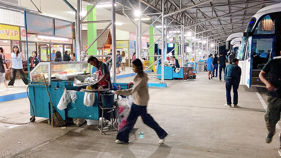 トラックの荷台を客席に改造したソンテウは、遠くに2台が駐まっているものの、そのちかくに人の姿は見えない。ターミナルの中の券売所はタイ語のみの案内にて、何が何やら分からない。すこし離れたところに複数の飲食店を認め、そこまでスーツケースを曳いていく。