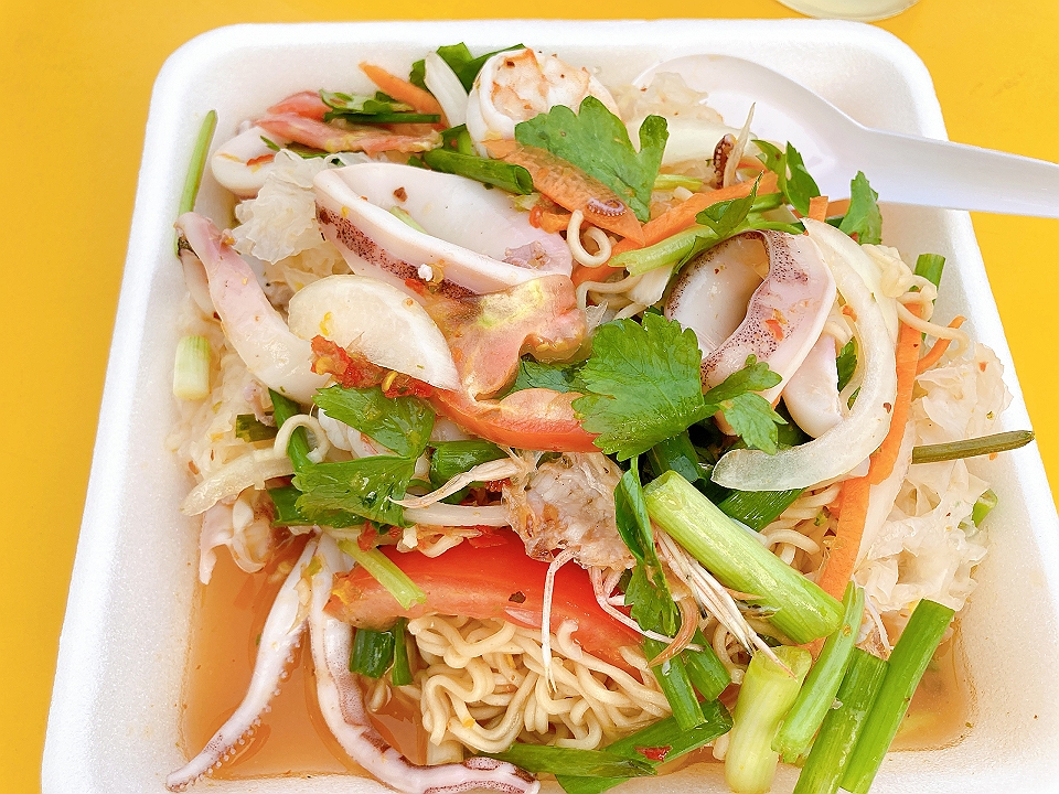 晩飯 ナイトバザール奧のフードコートのヤムママー、ラム”Sang Som”(ソーダ割り)