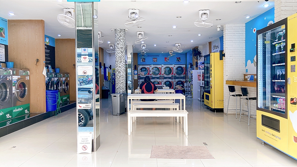 僕の持ち込んだ衣類はたかだか数日分だから、洗濯機は9キログラム用の、もっとも小さなもので済む。その代金は冷水による洗濯で40バーツ。その前に壁の自動販売機にて、液体洗剤を5バーツで買う。そして洗濯機に衣類を入れ、ガラスのドアを閉め、上のフタを開けて液体洗剤を流し入れる。しかして後に10バーツ硬貨4枚を次々と所定の場所に入れ、スタートボタンを押すと、洗濯機はただちに回り始めた。