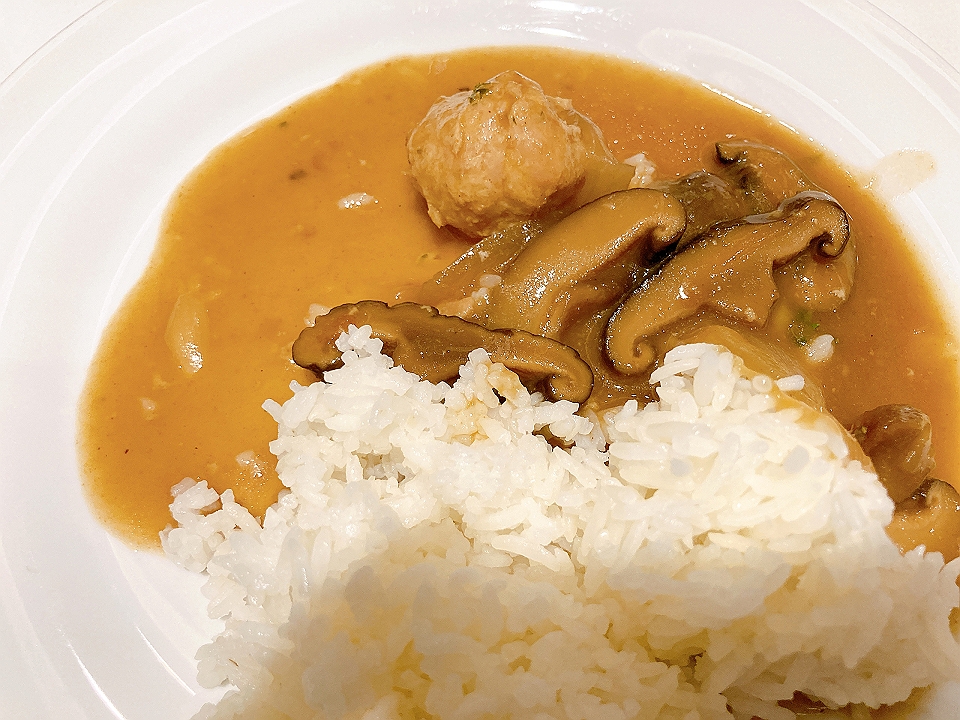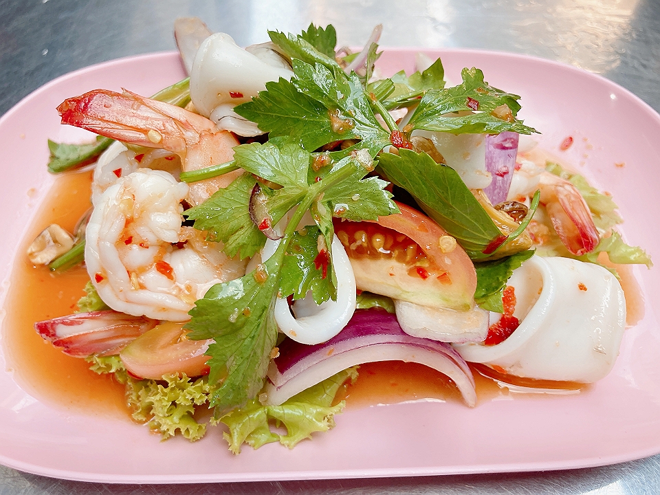 晩飯 アダージョホテル前の屋台のヤムタレー、コームーヤーン、シンハビール、スワンナプーム空港ミラクルラウンジのチキンミートボールと椎茸のクリーム煮をかけたごはん