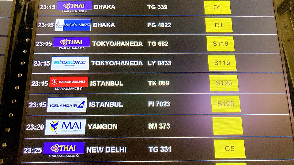 19:22 エアポートレイルリンクの車両が空港に着。プロンポンからの所要時間は57分。つまり空港とプロンポンのあいだは2回の乗り換えを要しても、今回の往路の方が9分だけ速かった、ということになる。しかしエアポートレイルリンクで確実に座りたければ、今回のように、始発のパヤタイから乗るべきだろう。