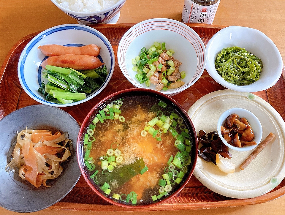 朝飯 牛蒡と人参のきんぴら、ウインナーソーセージと小松菜のソテー、納豆、めかぶの酢の物、なめこのたまり炊、たまり漬「七種きざみあわせ・だんらん」、らっきょうのたまり漬「小つぶちゃん」、ごぼうのたまり漬、メシ、豆腐と若布と万能葱の味噌汁