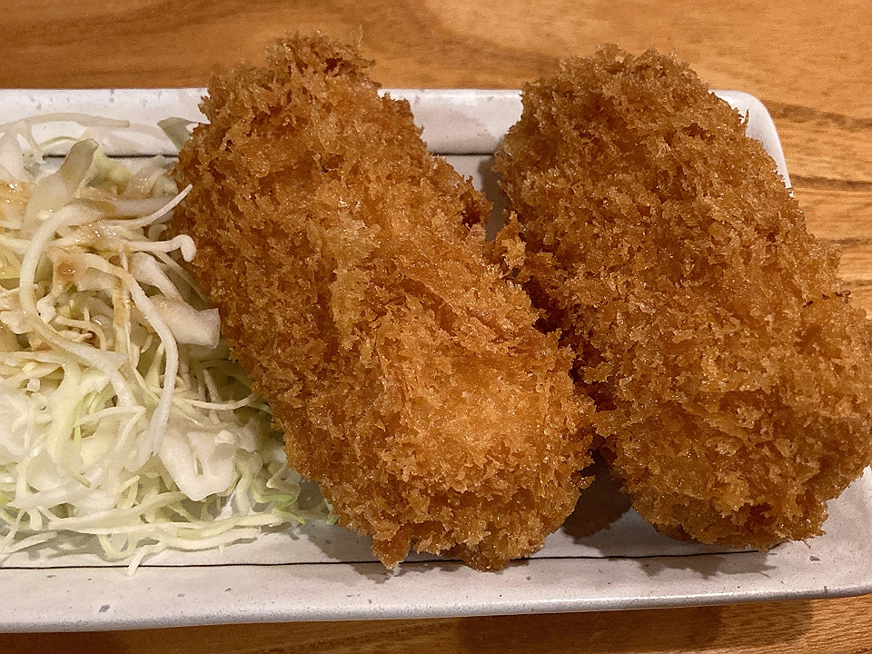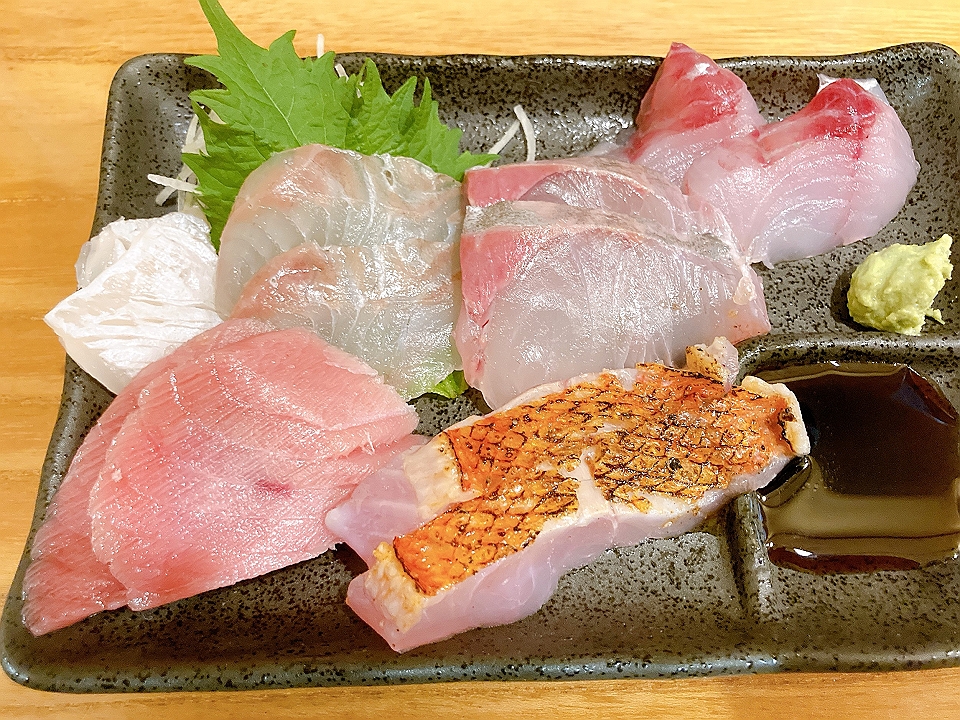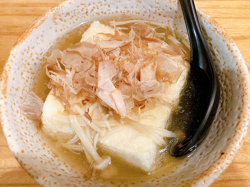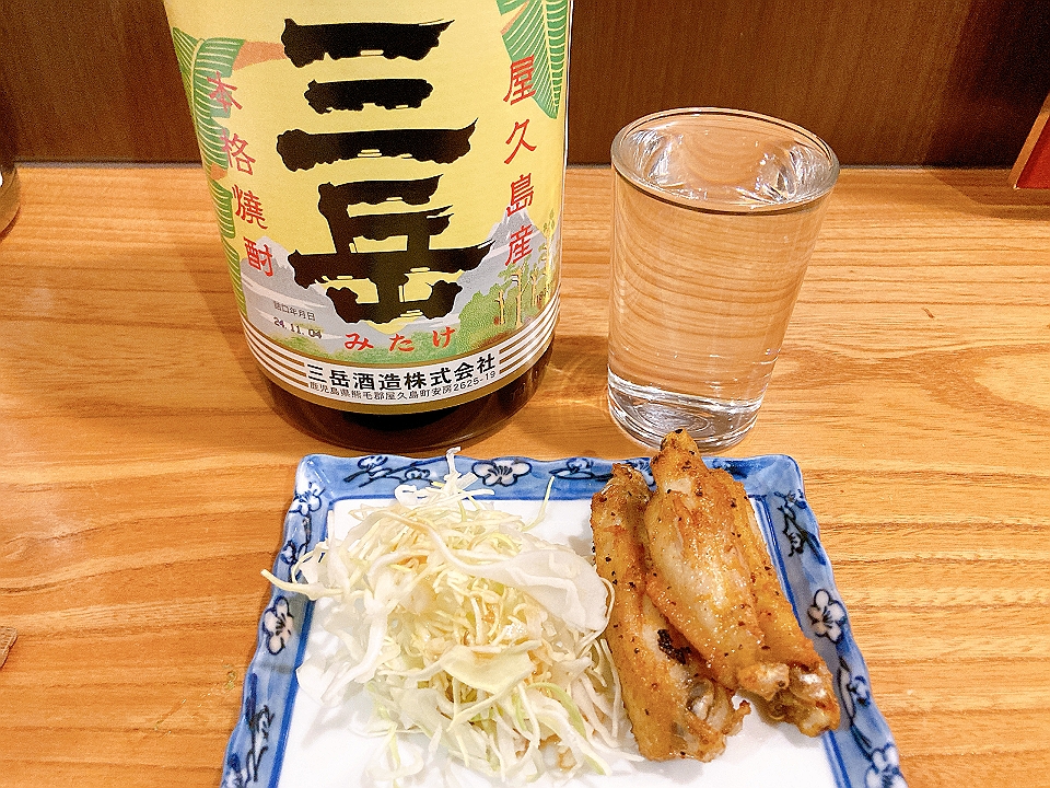 晩飯 「やまだ宴楽」のお通しの鶏手羽揚げ、刺身の盛り合わせ、揚げ出し豆腐、クリームコロッケ、他あれこれ、芋焼酎「三岳」(お湯割り)