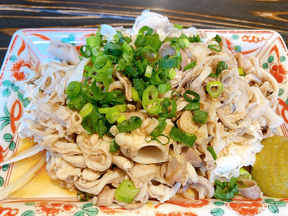 晩飯 「和光」のお通しの独活と油揚げの煮つけ、鰹の刺身のたたき風、ポテトサラダ、タン焼き、牛すじ肉のカレー煮、麦焼酎「吉四六」(お湯割り)