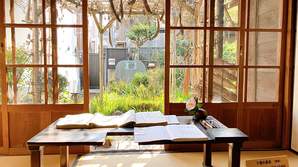 子規の家は関東大震災で壊れて修復をされ、第二次世界大戦の空襲では全焼をした。現在の家は寒川鼠骨の尽力により再建をされたものだから、いわばレプリカである。それでも脊椎カリエスを原因として立て膝のまま動かなくなった左脚が当たらないよう一部を切り欠かれた子規の机の布団に座してみれば、目の前に庭にはヘチマの棚があって、すこし感動をした。