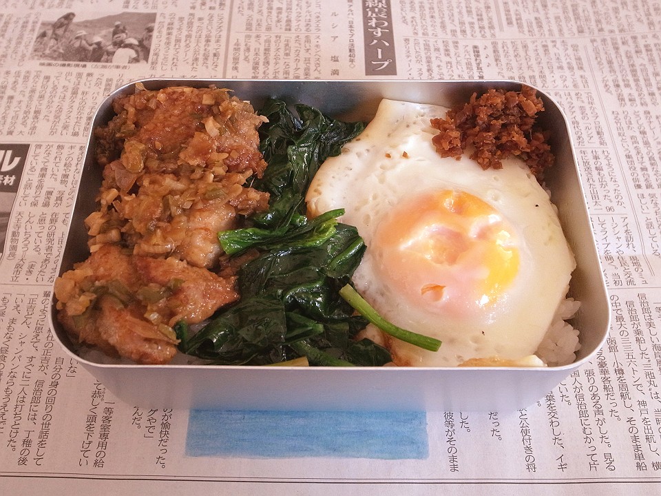 朝飯 納豆、昆布の沖縄風炒め、厚揚げ豆腐の炊き物、ほうれん草のソテー、目玉焼き、千枚漬け、メシ、ほうれん草と三つ葉の味噌汁