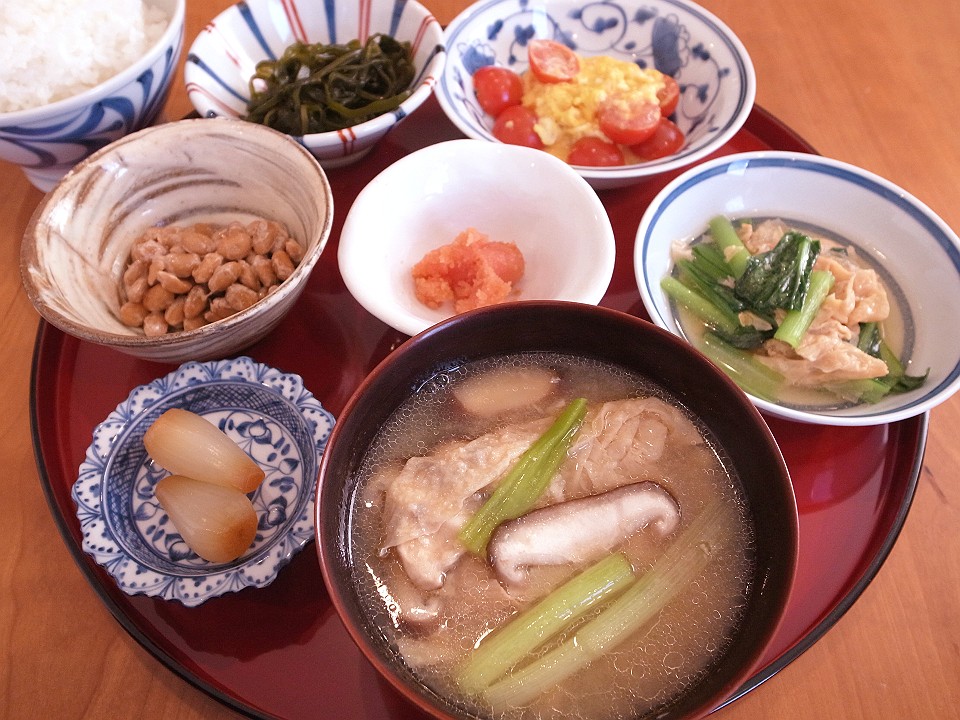 朝飯 らっきょうのたまり漬、納豆、切り昆布の炒り煮、トマトのスクランブルドエッグ、揚げ湯波と小松菜の淡味炊き、めんたいこ、メシ、揚げ湯波と椎茸と長葱の味噌汁