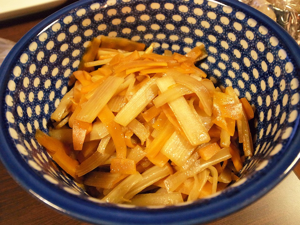 朝飯 蕗のおひたし、胡瓜のたまり浅漬け、納豆、飛竜頭と芥子菜の淡味炊き、独活と人参のきんぴら、きゅうりのたまり漬、らっきょうのたまり漬、メシ、シジミとトマトと三つ葉の味噌汁