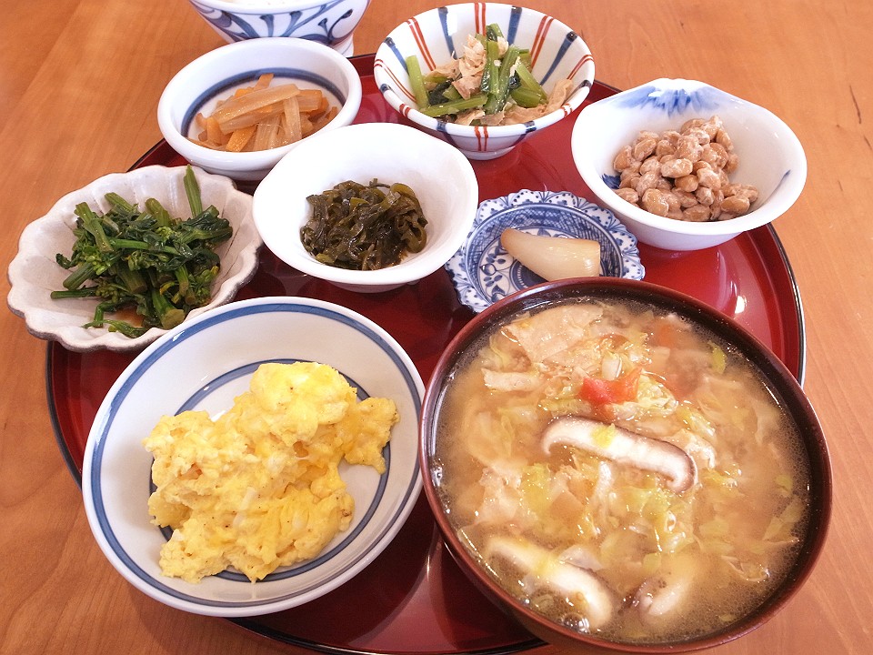 朝飯 スクランブルドエッグ、カキ菜のたまり浅漬け、独活と人参のきんぴら、揚げ湯波と小松菜の淡味炊き、納豆、切り昆布の炒り煮、らっきょうのたまり漬、メシ、揚げ湯波とキャベツと椎茸とトマトの味噌汁