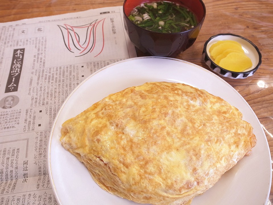 朝飯 めんたいこ、塩豆と三つ葉の卵とじ、揚げ湯波と小松菜の淡味炊き、切り昆布の炒り煮、らっきょうのたまり漬、メシ、揚げ湯波とキャベツと長葱の味噌汁
