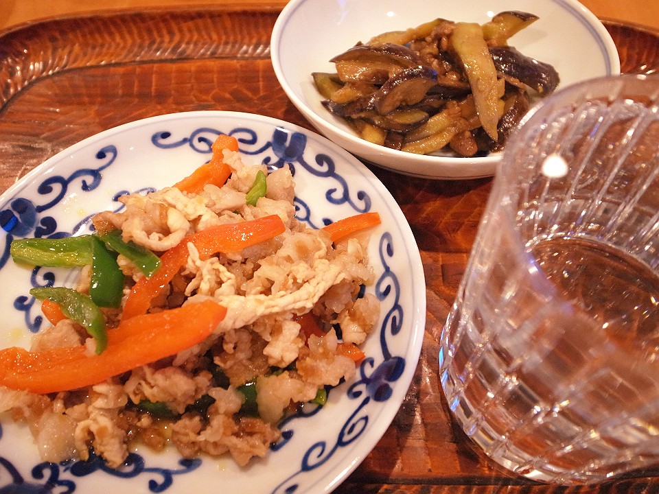 晩飯 鯛のかぶと煮、茄子の日光味噌「ひしお」炒め、たまり漬「刻みザクザクしょうが」を使った豚の生姜焼き、黒糖焼酎「里の曙」(お湯割り)