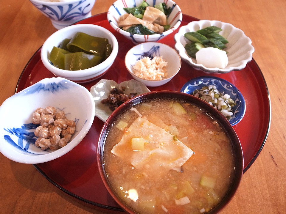 朝飯 納豆、煮昆布、揚げ湯波と小松菜の炊き合わせ、胡瓜と蕪のぬか漬け、塩鮭、たまり漬「おばあちゃんのホロホロふりかけ」、すぐき、メシ、きのうのミネストローネの残りと揚げ湯波による味噌汁