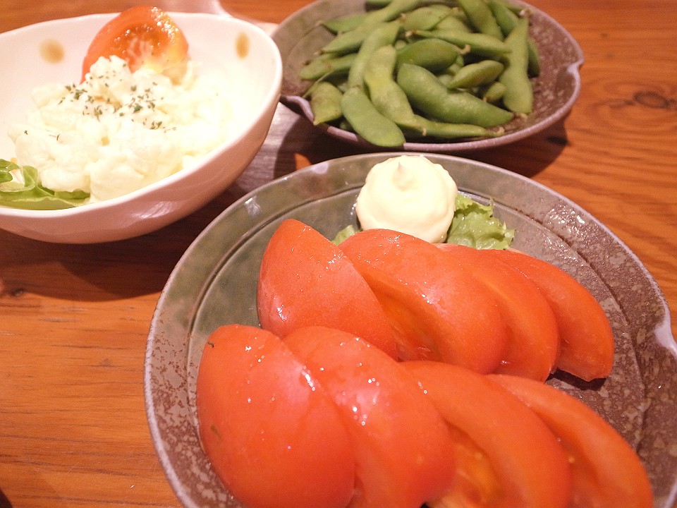 晩飯 「じみち」の枝豆、ポテトサラダ、冷やしトマト、ベーコンエッグ、チューハイ、それを濃くするための「焼酎オンザロックの氷抜き」