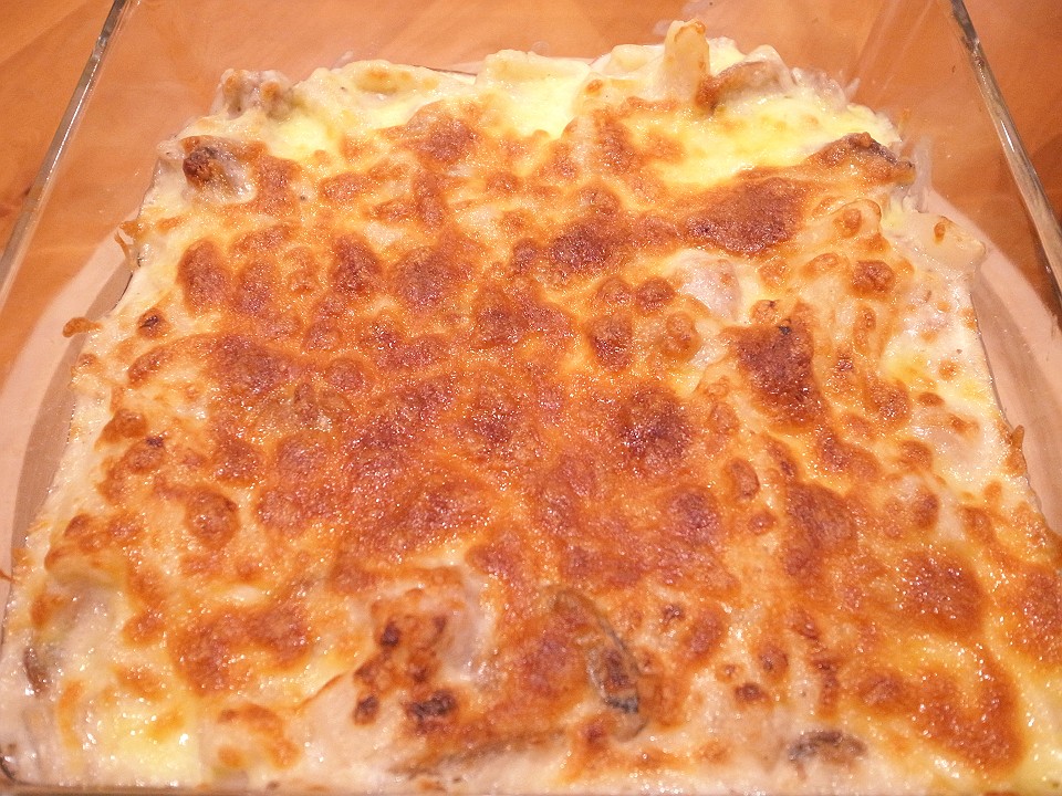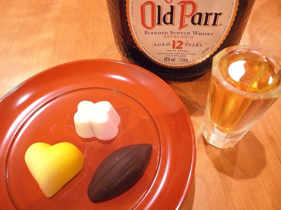 晩飯 “TIO PEPE”、ベビーリーフとルッコラのサラダ、ラタトゥイユ、パン、鶏とマカロニのグラタン、“Petit Chablis Billaud Simon 2015”、チョコレート、“Old Parr”(生)