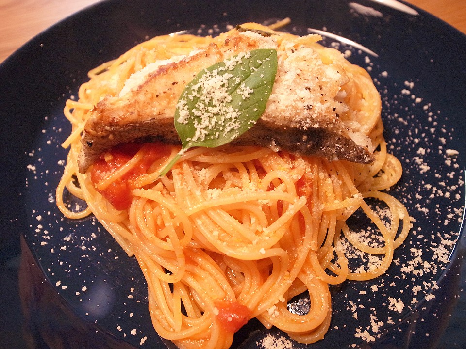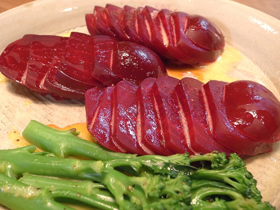 晩飯 ビーツとブロッコリーのサラダ、夏野菜の南蛮漬け、鱈とトマトのスパゲティ、“Petit Chablis Billaud Simon 2015”、お菓子もろもろ、グラッパ