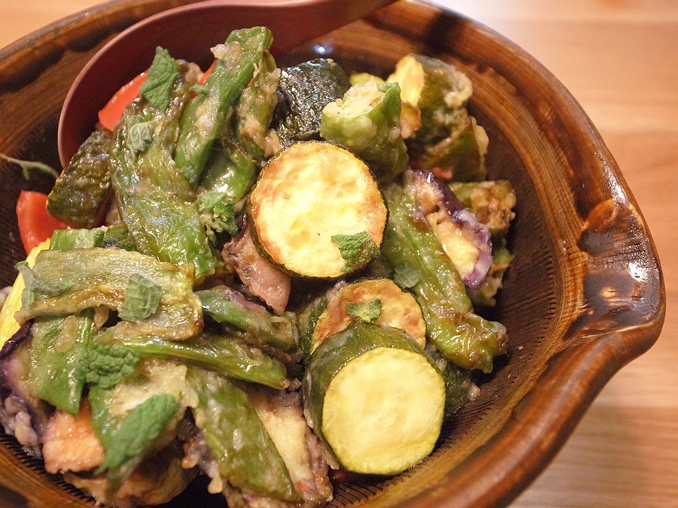晩飯 茄子とピーマンの素揚げ、「なめこのたまりだき」の冷や奴、生のトマト、夏太郎らっきょう、素麺、「寳焼酎極上」と麦焼酎「のんじょくれ」の混合(ソーダ割り)