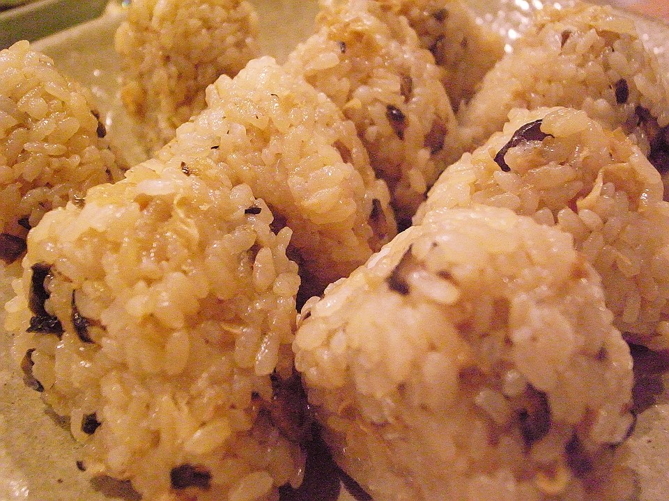 朝飯 きのうの残りの塩おむすびと「しいたけのたまり炊」のおむすび、胡瓜の「日光味噌のたまり浅漬けの素・朝露」漬け、ほうれん草の味噌汁