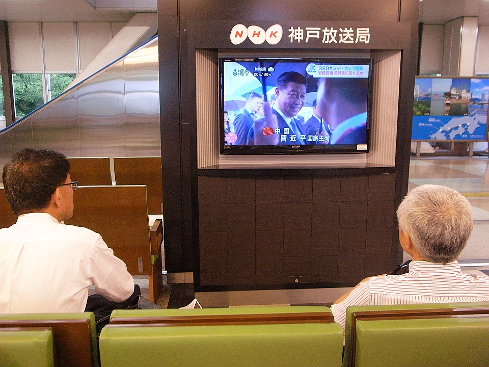 小一時間ほど前からの雨は、のぞみ133号が京都へ近づくに連れて止んだ。しかし大阪でまた降り始め、外へ出た三ノ宮では、歩道に溜まった水の浸入を防ごうとする商店もあった。当方は地理不案内にて、iPhoneのgoogleマップを頼りに予約したホテルを探す。太平洋上から東北東へと進みつつある台風3号の影響か、湿度の高さは、おとといまでいたバンコクの比ではない。