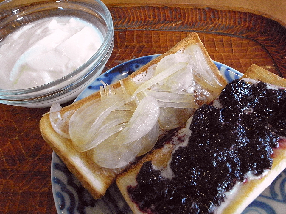 昼飯 バターとブルーベリージャムとらっきょうのたまり漬のトースト、ヨーグルト