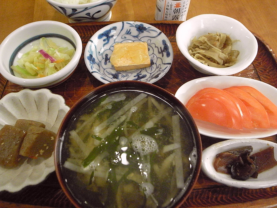 朝飯 こんにゃくの煮つけ、コールスロー、鮭の焼き漬け、牛蒡と人参のきんぴら、生のトマト、たまり漬「七種きざみあわせ・だんらん」、メシ、大根と若布の味噌汁