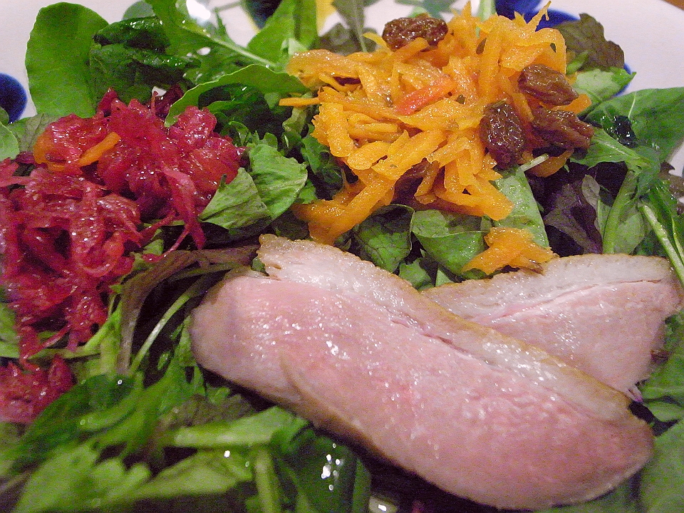 晩飯 「グルメやまなか」の鴨のサラダ、同じく鶏肉のベニエ、Petit Chablis Billaud Simon 2016